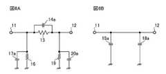 第1の状態時の等価回路を図6Aに示し、第2の状態の等価回路を図6Bに示す。実施の形態1の式(3)より高周波やR16,R19の値が大きい場合は、周波数に依存することなく第1の状態と第2の状態の位相変動を抑えることができる。また、容量は本π型減衰器の減衰量の絶対値には影響を与えない。これにより第1の状態と第2の状態で通過位相の変動を抑えた、通過振幅の異なる特性を得ることができる。Next, the operation of the variable attenuator of