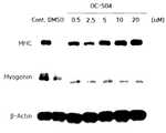 마우스 근원세포주 C2C12를 12-웰 플레이트에 0.7X105 cells/well로 분주한 뒤, 세포 밀도가 70 내지 80%가 되도록 배양하였다. 그 후, 세포들을 PBS로 세척한 뒤 배지를 2% 말혈청(horse serum), 400μM의 H2O2, 및 하몰 (OC-503) 0nM (DMSO), 500nM, 1μM, 2.5μM, 5μM 또는 10μM이 포함된 DMEM 배지 (분화 배지)로 각각 교체하였다. 상기 배지는 격일로 교체하면서 5 내지 7일 동안 분화를 유도하였다.분화 후, 세포들을 현미경으로 확인하였으며, 세포들을 파쇄하여 분화 마커인 Myogenin 및 MHC(myosin heavy chain) 항체를 이용하여 대한 웨스턴 블롯 분석을 수행하였다.Mouse myoblast C2C12 was dispensed in a 12-well plate at 0.7 × 105 cells / well and then cultured to a cell density of 70-80%. The cells are then washed with PBS before the medium is washed with 2% horse serum, 400 μM of H2 O2 , and small (OC-503) 0 nM (DMSO), 500 nM, 1 μM, 2.5 μM, 5 μM or 10 μM. Each was replaced with the included DMEM medium (differentiation medium). The medium induced differentiation for 5-7 days with every other day. After differentiation, the cells were identified under a microscope, and cells were disrupted and Western blot analysis was performed using differentiation markers Myogenin and mycein heavy chain (MHC) antibodies.