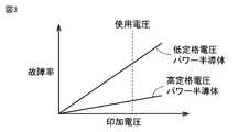 図3は、一般的なパワー半導体に関する定格電圧と故障率の関係を示した概念図である。図3には、同一定格電流で異なる定格電圧の2つのパワー半導体の故障率を示している。図3に示すように、印加電圧が大きくなるほど故障率が大きくなる。また、低定格電圧パワー半導体の方が、高定格電圧パワー半導体よりも、故障率が大きい。FIG. 3 is a conceptual diagram showing the relationship between the rated voltage and the failure rate for a general power semiconductor. FIG. 3 shows failure rates of two power semiconductors having the same rated current and different rated voltages. As shown in FIG. 3, the failure rate increases as the applied voltage increases. Also, the low rated voltage power semiconductor has a higher failure rate than the high rated voltage power semiconductor.