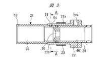 アウターチューブ11の基端部16は開口部を有し、開口部からインナーチューブ21とエンドチューブ22がアウターチューブ11の内部に挿入される。エンドチューブ22の中央部22aの外周面に設けられた雄ねじ23は、アウターチューブ11の基端部16の内周面に設けられた雌ねじ24にねじ結合され、エンドチューブ22はアウターチューブ11に締結される。インナーチューブ21はエンドチューブ22の内側に回転自在に装着されるとともに、インナーチューブ21の外周面は、エンドチューブ22の内周面に接触する。インナーチューブ21の基端部25はエンドチューブ22よりも突出しており、操作ノブ26が基端部25にピン27により取り付けられている。すなわち、操作ノブ26は、スプリング式タイマー10の基端部に設けられている。ピン27が嵌合される嵌合孔27aが、図2に示されように、インナーチューブ21の基端部25に形成されている。操作ノブ26を操作することによりインナーチューブ21が回転され、所定の回転角度に設定される。インナーチューブ21の回転角度を設定した後、インナーチューブ21が回転しないようにするために、止めねじ28がエンドチューブ22に取り付けられている。止めねじ28は、エンドチューブ22に形成されたねじ孔28aにねじ結合される。The