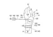 なお、各固定部材151、152、153は、患者の肢体に巻き付けた第2アーム部140の支持部143に対する固定、及び親指f1と人差し指f2との間を通した第1アーム部130の第2アーム部140に対する固定が可能である限り、具体的な構成は限定されない。例えば、各固定部材151、152、153を面ファスナーで構成する場合、面ファスナーの雄側と雌側を入れ替えた構成としてもよい。面ファスナーは、面的に着脱可能なファスナーであり、例えば、Magic Tape(登録商標)やVelcro(登録商標)である。また、例えば、各固定部材151、152、153は、スナップ、ボタン、クリップ、後述する実施形態で説明するような孔部529aが形成された部材529(図12を参照)等であってもよい。The fixing