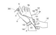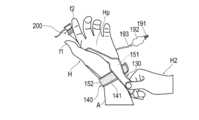 次に、術者等は、図6に示すように、第1アーム部130を患者の手Hの親指f1と人差し指f2の間に通す。次に、術者等は、図7に示すように、患者の手Hの掌Hp側で、第1アーム部130の一部を患者の肢体付近でベルト部141に重ねる。術者等は、第1アーム部130の内面側に配置された第1固定部材(面ファスナーの雌側)151をベルト部141の外面側に配置された第2固定部材(面ファスナーの雄側)152に接触させることにより、各固定部材151、152を介して、ベルト部141と第1アーム部130を固定させる。Next, the surgeon or the like passes the