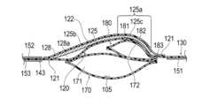 図3に示すように、マーカー部105は、例えば、第1拡張部170の体表面に向い合せて配置される側の面(内面)の内表面に配置することができる。ただし、マーカー部105は、例えば、第1拡張部170の体表面に向い合せて配置される側の面と反対側の面(外面)の内表面やその外表面、被覆部材110の本体部120の内表面や外表面、支持部材125の内表面や外表面、カバー部材128の内表面や外表面等に配置することも可能である。また、図3に示す断面図上において第1拡張部170の中央部と第2拡張部180の端部(支持部143側の端部)とが重なるように配置される場合、マーカー部105は、第2拡張部180の上記端部の外表面に配置してもよい。As shown in FIG. 3, for example, the