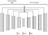 concatenating the convolutional layers of the downsampling stage and the convolutional layers of the upscaling stage having a same resolution with the convolutional layers of the downsampling stage.