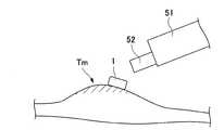 使用者は、内視鏡51およびカテーテル52を操作して、図2に示すように、カテーテル52の先端部を腫瘍Tmに接近させる。カテーテル52の先端部が望んだ位置となったら、使用者は、カテーテル52から薬物投与体1を放出する。放出された薬物投与体1は、図3に示すように、腫瘍Tm上あるいは腫瘍Tm付近の留置位置に置かれる(ステップA)。