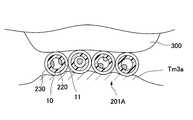 まず、薬物投与体201の寸法を小さくした薬物投与体201Aを複数準備し、図12に示すように、薬物投与体201Aを領域Tm3a上にのみ配置する。次に、図13に示すように、膨張したバルーン300を薬物投与体201Aに押し当てて、薬物投与体201Aを一時的に固定する。この状態で、薬物投与体201Aに溶解剤を散布して被膜230を溶解すると、図14に示すように、各薬物投与体201Aは、被膜230の溶解により露出した粘着層220により、領域Tm3a上のみに精度よく固定される。その結果、領域Tm3aに対する治療と、領域Tm3bの観察とを好適に両立できる。When performing a treatment for such an area Tm3, the drug administration body of the present embodiment can be suitably used.