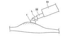 次に、薬物投与体1に内視鏡経由で誘導体を供給する(ステップB)。薬物投与体1を放出した後のカテーテル52にシリンジ(不図示)を接続し、図4に示すように、カテーテル52から誘導体を含む液体Lを薬物投与体1に散布する。誘導体と接触した前駆体層20は、ゲル化して粘性を発揮し、図5に示すように薬物投与対象の腫瘍Tmに対して確実に接着する(ステップC)。
