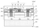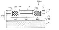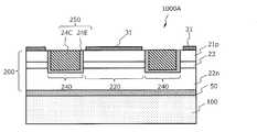 フロントプレーン200は、複数のμLED220と、複数のμLED220の間に位置する素子分離領域240とを含む。複数のμLED220は、基板100の上面100Tに平行な2次元平面(XY面)内において、行および列状に配列され得る。複数のμLED220のそれぞれは、図1Aに示されるように、第1導電型の第1半導体層21および第2導電型の第2半導体層22を有する。第2半導体層22は、第1半導体層21に比べて、基板100に近い位置にある。<Front plane>