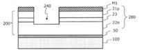 上記半導体層を含む半導体積層構造280を基板100上に形成した後、図4Cに示すように、マスクM1を第1半導体層21上に形成する。マスクM1は、素子分離領域240の形状および位置を規定する開口部を有している。言い換えると、マスクM1は、μLED220の形状および位置を規定する。半導体積層構造280のうち、マスクM1によって覆われていない部分を上面からエッチングすることにより、図4Dに示すように、素子分離領域240を規定するトレンチを形成する。このエッチング(メサエッチング)は、例えば誘導結合性プラズマ(ICP)エッチング法または反応性イオンエッチング(RIE)法によって行うことができる。エッチングの深さは、トレンチの底部に第2半導体層22が現れるように決定される。エッチングによって形成されるトレンチの深さは例えば0.5μm以上5μm以下、トレンチの幅は例えば5μm以上100μm以下であり得る。個々のμLED220の横幅は、例えば5μm以上100μm以下、典型的には15μmであり得る。エッチングによってμLED220の側面220Sが露出している。言い換えると、個々のμLED220は、エッチングされた側面(etched side surfaces)220sを有している。図4Eは、第2半導体層22の上面付近がエッチングされた状態を模式的に示している。After the semiconductor laminated