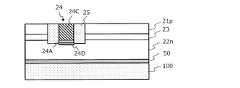 図7Dに示すように、埋め込み絶縁物25の一部にn-GaN層22nに達する貫通孔(スルーホール)26を形成する。このスルーホール26は、金属プラグ24の位置および形状を規定する。スルーホール26は、例えば一辺が5μm以上の矩形形状、また直径5μm以上の円形を有している。また、スルーホール26は、例えば図1Cおよび図1Dに示されるような形状を有する金属プラグ24を収容する形状を有していてもよい。As shown in FIG. 7D, a through hole (through hole) 26 reaching the n-