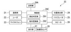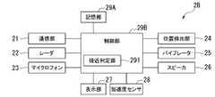 FIG. 3 is a block diagram showing a configuration example of the firstmobile terminal 2 according to the present embodiment. As shown in FIG. 3, the firstmobile terminal 2 includes acommunication unit 21, aradar 22, amicrophone 23, aposition detection unit 24, avibrator 25, aspeaker 26, adisplay unit 27, anacceleration sensor 28, and acontrol unit 29. The firstmobile terminal 2 may include an operation unit.