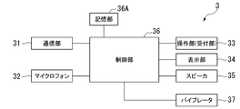FIG. 4 is a block diagram showing a configuration example of the secondmobile terminal 3 according to the present embodiment. As shown in FIG. 4, the secondmobile terminal 3 includes acommunication unit 31, amicrophone 32, anoperation unit 33, adisplay unit 34, aspeaker 35, acontrol unit 36, and avibrator 37.