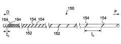 さらに、図6に示す補強パイプ150では、この螺旋状スリット152によって、隣り合う2つのスリット部154が、遠位側(D)から近位側(P)にかけて徐々に拡大している。本発明において、この補強パネルにおける隣り合う2つのスリット部の間隔は、連続に拡大するものであっても不連続に拡大するものであってもよい。補強パイプ150における隣り合う2つのスリット部154の間隔は、必ずしも限定されず、当業者によって任意の長さを選択することができる。1つの実施形態では、遠位側(D)における隣り合う2つのスリット部154の間隔(Id)は、例えば、0.1mm~2mm、好ましくは0.3mm~1mmであり、そして近位側(P)における隣り合う2つのスリット部154の間隔(Ip)は、例えば、2mm~20mm、好ましくは4mm~10mmである。Further, in the reinforcing