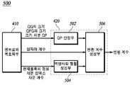 본 개시에 따른 다른 실시예에 있어서, QP 산정 단위(예컨대, QG 또는 QPG)의 가로 픽셀의 개수와 세로 픽셀의 개수를 기반으로 QP 산정 단위의 위쪽 또는 좌측 주변 블록의 QP를 선택함으로써, QP 산정부(502)는 산정 단위에 대한 QP를 예측할 수 있다.In another embodiment according to the present disclosure, by selecting the QP of the upper or left neighboring block of the QP calculation unit based on the number of horizontal pixels and the number of vertical pixels of the QP calculation unit (eg, QG or QPG), the QP calculation The