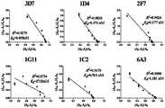 然后用Friguet法(J Immunol Methods.1985;77:305-19)测定各抗体的平衡解离常数Kd,即抗体的亲和力。主要步骤简述如下。96孔酶标板购自江海玻璃仪器总厂。重组人PD-L1-his蛋白由实施例1制备。用NaHCO3缓冲液(pH 9.6)包被蛋白,4℃过夜,包被浓度为5μg/mL。用含5%胎牛血清(FBS)的磷酸盐缓冲液(PBS)37℃封闭30分钟。用含5%胎牛血清(FBS)的磷酸盐缓冲液(PBS)(抗体稀释液)稀释PD-L1-his抗原蛋白,得到12个不同梯度的稀释液(0、0.349nM、0.697nM、1.395nM、2.79nM、5.58nM、11.2nM、22.3nM、44.6nM、89.3nM、178.4nM、357nM)后,然后加入恒定浓度的待测抗PD-L1抗体,100μL/孔,37℃孵育1小时。然后将共孵育复合物加入酶标板,室温2小时。PBST洗5遍后,1:5000孵育羊抗鼠HRP二抗(美国Santacruz公司,货号:sc-2005),37℃孵育30分钟,PBST洗5遍后拍干,用3,3,5,5-四甲基联苯胺(3,3,5,5-tetraamthyl benzidine,TMB)底物显色,37℃孵育15分钟,用2M稀硫酸终止后用酶标仪(美国Thermo公司)在450nm波长下读取吸光度(A)值。然后计算Kd值。图2为各抗体亲和力测定的结果,其最后结果汇总于表5。Then the Friguet method (J Immunol Methods. 1985; 77: 305-19) was used to determine the equilibrium dissociation constant Kd of each antibody, that is, the affinity of the antibody. The main steps are briefly described as follows. The 96-well microtiter plate was purchased from Jianghai Glass Instrument Factory. The recombinant human PD-L1-his protein was prepared in Example 1. The protein was coated with NaHCO3 buffer (pH 9.6) at 4°C overnight, and the coating concentration was 5 μg/mL. Block with phosphate buffered saline (PBS) containing 5% fetal bovine serum (FBS) at 37°C for 30 minutes. Dilute the PD-L1-his antigen protein with phosphate buffered saline (PBS) (antibody diluent) containing 5% fetal bovine serum (FBS) to obtain 12 different gradient dilutions (0, 0.349nM, 0.697nM, 1.395 nM, 2.79nM, 5.58nM, 11.2nM, 22.3nM, 44.6nM, 89.3nM, 178.4nM, 357nM), then add a constant concentration of anti-PD-L1 antibody to be tested, 100μL/well, and incubate at 37°C for 1 hour. Then add the co-incubation complex to the microtiter plate at room temperature for 2 hours. After washing 5 times with PBST, incubate goat anti-mouse HRP secondary antibody (Santacruz, USA, product number: sc-2005) at 1:5000, incubate at 37°C for 30 minutes, wash 5 times with PBST and pat dry,