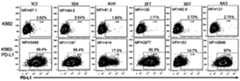 将PD-L1抗体VL区和VH区拼接进行基因合成,合成后的PD-L1嵌合抗原受体基因,均转载至慢病毒载体pHAGE-EF1α-MCS-ZsGreen(购自哈佛大学医学院,货号:EvNO00061636),从而获得基于6个PD-L1单抗的可识别人PD-L1的CAR:1C2 CAR、1D4 CAR、1G11 CAR、2F7 CAR、3D7 CAR和6A3 CAR(PD-L1 CAR元件结构示意图见图10)。其中,CD8 SP代表源于人CD8抗原信号肽(CD8 SP)的序列,PD-L1 VL代表抗PD-L1抗体的VL序列,PD-L1 VH代表抗PD-L1抗体的VH序列,CD28、4-1BBL以及CD3ζ代表各自相应的元件,均为常用的CAR构建所需元件。具体地,CD8 SP的编码核酸序列如SEQ ID NO:51所示,氨基酸序列如SEQ ID NO:52所示;CD28元件的编码核酸序列如SEQ ID NO:53所示,氨基酸序列如SEQ ID NO:54所示;4-1BBL元件的编码核酸序列如SEQ ID NO:55所示,氨基酸序列如SEQ ID NO:56所示;CD3ζ元件的编码核酸序列如SEQ ID NO:57所示,氨基酸序列如SEQ ID NO:58所示。1C2 CAR的编码核酸序列如SEQ ID NO:59所示,氨基酸序列如SEQ ID NO:60所示;1D4 CAR的编码核酸序列如SEQ ID NO:61所示,氨基酸序列如SEQ ID NO:62所示;1G11 CAR的编码核酸序列如SEQ ID NO:63所示,氨基酸序列如SEQ ID NO:64所示;2F7 CAR的编码核酸序列如SEQ ID NO:64所示,氨基酸序列如SEQ ID NO:66所示;3D7 CAR的编码核酸序列如SEQ ID NO:67所示,氨基酸序列如SEQ ID NO:68所示;6A3 CAR的编码核酸序列如SEQ ID NO:69所示,氨基酸序列如SEQ ID NO:70所示。The VL and VH regions of the PD-L1 antibody were spliced for gene synthesis, and the synthesized PD-L1 chimeric antigen receptor genes were all transferred to the lentiviral vector pHAGE-EF1α-MCS-ZsGreen (purchased from Harvard Medical School, catalog number :EvNO00061636), so as to obtain the CAR that can recognize human PD-L1 based on 6 PD-L1 monoclonal antibodies: 1C2 CAR, 1D4 CAR, 1G11 CAR, 2F7 CAR, 3D7 CAR and 6A3 CAR (PD-L1 CAR element structure diagram see Figure 10). Among them, CD8 SP represents the sequence derived from the human CD8 antigen signal peptide (CD8 SP), PD-L1 VL represents the VL sequence of the anti-PD-L1 antibody, PD-L1 VH represents the VH sequence of the anti-PD-L1 antibody, CD28, 4 -1BBL and CD3ζ represent their respective components, which are commonly used components for CAR construction. Specifically, the coding nucleic acid sequence of CD8 SP is shown in SEQ ID NO: 51, and the amino acid sequence is shown in SEQ ID NO: 52; the coding nucleic acid sequence of CD28 element is shown in SEQ ID NO: 53, and the amino acid sequence is shown in SEQ ID NO. The coding nucleic acid sequence of the 4-1BBL element is shown in SEQ ID NO: 55, and the amino acid sequence is shown in SEQ ID NO: 56; the coding nucleic acid sequence of the CD3ζ element is shown in SEQ ID NO: 57, and the amino acid sequence is shown in SEQ ID NO: 57. As shown in SEQ ID NO: 58. The coding nucleic acid sequence of 1C2 CAR is shown in SEQ ID NO: 59, and the amino acid sequence is shown in SEQ ID NO: 60; the coding nucleic acid sequence of 1D4 CAR is shown in SEQ ID NO: 61, and the amino acid sequence is shown in SEQ ID NO: 62 Show; 1G11 CAR coding nucleic acid sequence is shown in SEQ ID NO: 63, amino acid sequence is shown in SEQ ID NO: 64; 2F7 CAR coding nucleic acid sequence is shown in SEQ ID NO: 64, and amino acid sequence is shown in SEQ ID NO: 66; 3D7 CAR coding nucleic acid sequence is shown in SEQ ID NO: 67, amino acid sequence is shown in SEQ ID NO: 68; 6A3 CAR coding nucleic acid sequence is shown in SEQ ID NO: 69, and amino acid sequence is shown in SEQ ID NO: 70 shown.
