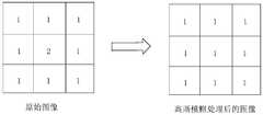 本申请较佳地,所述高斯模糊用来处理所述原始细胞集的图像噪声,所述高斯模糊是依次遍历所述原始细胞集内细胞图片集内的每个像素,计算与所述每个像素相邻的八个像素的像素值的和值,并将所述和值除以八得到平均像素值,将所述平均像素值代替所述每个像素。具体地,当所述原始细胞集内细胞的像素点如说明书附图2所述,其中所述说明书附图2左图部分中心数字2是所述原始细胞集细胞的噪点,对所述中心数字2做高斯模糊处理是计算所述中心数字2周边所有像素的平均值,所述中心数字2周边所有像素的平均值为1,即高斯模糊处理后,所述中心数字2的结果变为1。Preferably, the Gaussian blur is used to process the image noise of the original cell set, and the Gaussian blur is to sequentially traverse each pixel in the cell picture set in the original cell set, and calculate the A sum of the pixel values of eight adjacent pixels of the pixel, and dividing the sum by eight to obtain an average pixel value, and substituting the average pixel value for each pixel. Specifically, when the pixel points of the cells in the original cell set are as described in Figure 2 of the specification, the