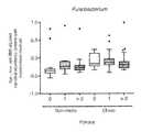 도 2a 내지 2d는 섬유증 중증도에 따른 특정 미생물 분류군의 차이에 대한 단변량 분석결과이다. 명확성을 위하여 13 과(family)- 및 14 속(genus)- 수준 분류군을 상위 상대적 개체풍부도와 함께 표시하였다. 박스(box) 플롯은 Tukey whiskers가 있는 첫번째와 세번째 4분위수 사이의 4분위수간 영역(interquartile range, IQR)을 나타낸다. 박스 안의 색상은 섬유증 중증도를 나타낸다. 통계적 유의성은 비모수 크루스칼-왈리스 테스트를 이용하였다.*P<0.05,**P<0.01,***P<0.0012A to 2D are univariate analysis results for differences in specific microbial taxa according to fibrosis severity. For clarity, 13 family- and 14 genus-level taxa are shown along with the upper relative population abundance. The box plot shows the interquartile range (IQR) between the first and third quartiles with Tukey whiskers. The color in the box indicates the severity of fibrosis. For statistical significance, the nonparametric Kruskal-Wallis test was used.*P <0.05,**P <0.01,***P <0.001