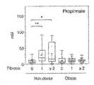 (c) 장내 단쇄지방산(short chain fatty acid)들로 이루어진 군에서 선택된 어느 하나 이상의 검출 마커와 관련하여, 예를 들어 아세트산(acetate), 프로피오네이트 (propionate) 및 부티레이트(butyrate)으로 이루어지는 군에서 선택된 하나 이상의 대변 내 함량이 증가하는 경우, 일 예로 프로피오네이트(propionate) 의 대변내 함량이 증가하는 경우, 섬유증의 중증도가 높은 것으로 결정하는 단계를 포함할 수 있다.(c) In relation to any one or more detection markers selected from the group consisting of short chain fatty acids in the intestine, for example, in the group consisting of acetic acid, propionate and butyrate. When the content of the selected one or more stool increases, for example, when the stool content of propionate increases, determining that the severity of fibrosis is high.