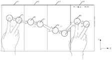 具体的,用户对于多个不相邻的界面执行截屏操作,可采取手指运动轨迹进行截屏。用户在需要截屏界面的最左边,两指按压一个界面超过一段时间(例如大于0.2s),并移动两指向右滑动(或者,用户在需要截屏应用的最右边,两指按压一个界面超过一段时间。并移动两指向左滑动),当过渡到某一界面,Y轴坐标无明显偏移则对该应用进行选取,Y轴坐标向下偏离程度大于目标阈值时,则不对该界面进行选取,随后过渡到下一界面向上偏离程度大于目标阈值时,则继续选取,否则仍不选取。Specifically, when the user performs a screenshot operation on multiple non-adjacent interfaces, the user may take a finger motion track to take a screenshot. The user presses an interface with two fingers for more than a period of time (for example, greater than 0.2s) on the far left of the screen where the user needs to take a screenshot, and moves two fingers to slide to the right (or the user presses an interface with two fingers for more than a period of time on the far right of the application that needs to take a screenshot . And move two fingers to slide left), when transitioning to an interface, the Y-axis coordinate has no obvious deviation, the application is selected, and the downward deviation of the Y-axis coordinate is greater than the target threshold, the interface is not selected, and then When transitioning to the next interface, when the upward deviation degree is greater than the target threshold, the selection is continued, otherwise it is still not selected.