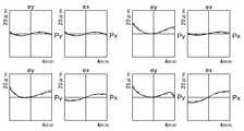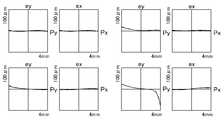 図18B、図18C、及び図18Dに、実施例6に係る光学装置100において、それぞれ視度+2、-1、及び-5(比A/B=0.204,0.201,0.196)に対して検出された横収差を示す。ここで、左上の一組の図は像の中心、右上の一組の図は像の上下端中心、左下の一組の図は左右端中心、右下の一組の図は対角での収差をそれぞれ示す。Py,Pxは(アイボックスの位置における)絞り面上の座標(フルスケール4mm)であり、ey,exはそれぞれタンジェンシャル面の収差量及びサジタル面の収差量(フルスケールは各図中に示す)である。実線は波長0.515μm、点線は波長0.528μm、一点鎖線は波長0.544μmに対する収差を示す。18B, 18C, and 18D show diopters +2, -1, and -5 (ratio A / B = 0.204, 0.201, 0.196) in theoptical device 100 according to the sixth embodiment, respectively. Indicates the detected lateral aberration. Here, the upper left set of figures is the center of the image, the upper right set of figures is the center of the upper and lower ends of the image, the lower left set of figures is the center of the left and right edges, and the lower right set of figures is diagonal. The aberrations are shown respectively. Py and Px are the coordinates (full scale 4 mm) on the aperture surface (at the position of the eyebox), and ey and ex are the amount of aberration on the tangential plane and the amount of aberration on the sagittal plane (full scale is shown in each figure). ). The solid line shows the aberration with respect to the wavelength of 0.515 μm, the dotted line shows the aberration with respect to the wavelength of 0.528 μm, and the alternate long and short dash line shows the aberration with respect to the wavelength of 0.544 μm.
