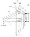 図22H(視度+2、比A/B=0.301)において、像面は、タンジェンシャル面上では表示器110の中心からの位置に応じて大きく振動し、中心に対して周辺において下流側で結像し、サジタル面上では表示器110の中心からの位置に応じて緩やかに変動し、中心に対して周辺において下流側で結像している。なお、波長依存性はほとんど見られない。像歪みは、表示器110の中心に対して周辺において負の歪みを示す、すなわち像は樽型に歪曲している。In FIG. 22H (diopter +2, ratio A / B = 0.301), the image plane vibrates greatly depending on the position from the center of thedisplay 110 on the tangential plane, and is downstream of the center in the periphery. On the sagittal plane, it gradually fluctuates according to the position from the center of thedisplay 110, and the image is formed on the downstream side in the periphery with respect to the center. There is almost no wavelength dependence. The image distortion shows a negative distortion around the center of thedisplay 110, that is, the image is barrel-shaped.