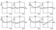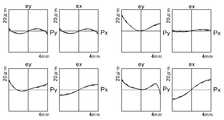 図20B、図20C、及び図20Dに、実施例8に係る光学装置100において、それぞれ視度+2、-1、及び-5(比A/B=0.173,0.170,0.166)に対して検出された横収差を示す。ここで、左上の一組の図は像の中心、右上の一組の図は像の上下端中心、左下の一組の図は左右端中心、右下の一組の図は対角での収差をそれぞれ示す。Py,Pxは(アイボックスの位置における)絞り面上の座標(フルスケール4mm)であり、ey,exはそれぞれタンジェンシャル面の収差量及びサジタル面の収差量(フルスケールは各図中に示す)である。実線は波長0.515μm、点線は波長0.528μm、一点鎖線は波長0.544μmに対する収差を示す。20B, 20C, and 20D show diopters +2, -1, and -5 (ratio A / B = 0.173, 0.170, 0.166) in theoptical device 100 according to the eighth embodiment, respectively. Indicates the detected lateral aberration. Here, the upper left set of figures is the center of the image, the upper right set of figures is the center of the upper and lower ends of the image, the lower left set of figures is the center of the left and right edges, and the lower right set of figures is diagonal. The aberrations are shown respectively. Py and Px are the coordinates (full scale 4 mm) on the aperture surface (at the position of the eyebox), and ey and ex are the amount of aberration on the tangential plane and the amount of aberration on the sagittal plane (full scale is shown in each figure). ). The solid line shows the aberration with respect to the wavelength of 0.515 μm, the dotted line shows the aberration with respect to the wavelength of 0.528 μm, and the alternate long and short dash line shows the aberration with respect to the wavelength of 0.544 μm.