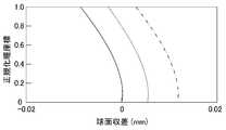 図2Aに、レンズ310のハーフミラー面(HM)311の面形状の一例を示す。ここで、実線は、ハーフミラー面(HM)311の非球面形状を面径に対する面位置Zにより示す。破線は、ハーフミラー面(HM)311の曲面角度の変化量Δθを面径に対して示す。ハーフミラー面311の面形状は、中心から外側に離れるほど面位置Zがずれるが、曲面角度の変化量Δθは中心から外側に離れるほど減少傾向になっている。FIG. 2A shows an example of the surface shape of the half mirror surface (HM) 311 of thelens 310. Here, the solid line indicates the aspherical shape of the half mirror surface (HM) 311 by the surface position Z with respect to the surface diameter. The broken line indicates the amount of change Δθ of the curved surface angle of the half mirror surface (HM) 311 with respect to the surface diameter. In the surface shape of thehalf mirror surface 311, the surface position Z shifts as the distance from the center increases to the outside, but the amount of change Δθ of the curved surface angle tends to decrease as the distance from the center increases.