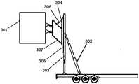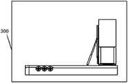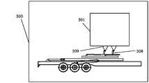 所述排气运输工具300还包括第三运输载体,排气系统301,举升机构,上下调节装置和平行四边形机构307集成在第三运输载体上。举升机构,包括第三液压缸302和第二连接板303,第三液压缸302的一端与第二连接板303连接,第三液压缸302的另一端与第三运输载体连接。通过第三液压缸302的伸缩实现第二连接板303由水平向竖直的转动。The