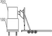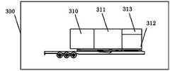 其中,100燃气涡轮发电运输工具,200进气通风运输工具,300排气运输工具,101进气口,102燃气涡轮发动机,103发电机,104电力控制系统,201进气过滤装置,202进气消音装置,203通风过滤装置,204通风消音装置,205通风风机,301排气系统,302第三液压缸,303第二连接板,304第一连接板,305第一液压缸,306第二液压缸,307平行四边形机构,308锁钩,309锁槽,310排气消音器,311排气弯头,312排气变径接头,313排气膨胀节。Among them, 100 gas turbine power generation vehicles, 200 air intake ventilation vehicles, 300 exhaust vehicles, 101 air inlets, 102 gas turbine engines, 103 generators, 104 power control systems, 201 air intake filter devices, and 202 air intakes Silencer, 203 ventilation filter device, 204 ventilation silencer, 205 ventilation fan, 301 exhaust system, 302 third hydraulic cylinder, 303 second connecting plate, 304 first connecting plate, 305 first hydraulic cylinder, 306 second hydraulic Cylinder, 307 parallelogram mechanism, 308 lock hook, 309 lock groove, 310 exhaust silencer, 311 exhaust elbow, 312 exhaust reducer, 313 exhaust expansion joint.