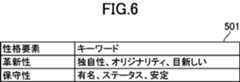記憶部131には、図6に示される話者の性格を構成する性格要素の各々について、性格要素を示すキーワードのリストである性格要素キーワードリスト501が記憶されている。本実施形態においては、話者の革新性を示すキーワードのリストと話者の保守性を示すキーワードのリストを含む性格要素キーワードリスト501が記憶されている。性格要素指標算出部109は、性格要素キーワードリスト501を参照して、客の発話テキスト中の革新性キーワードと保守性キーワードの個数をカウントし、革新性キーワードと保守性キーワードの個数の合計に対する革新性キーワードと保守性キーワードのそれぞれの割合である革新度と保守度を要素とするベクトルを性格要素指標として算出する。本実施形態においては、客の発話テキストにおいて、「オリジナリティ」という革新性キーワードと、「有名」という保守性キーワードが存在するので、革新度が0.5、保守度が0.5、すなわち(0.5,0.5)というベクトルの客の性格要素指標が算出される。性格要素指標は、これに限定されるものではなく、他の任意の適切な性格を構成する要素とすることができ、またスカラー量、3次元以上のベクトル、行列等の他の任意の適切な表現の指標とすることができ、また正規化されていない数値とすることができる。The