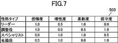 記憶部131には、図7に示されるように、複数の性格タイプの各々についての第1の性格モデルが、オペレータからの入力等によって設定部133により予め設定され、性格タイプの第1の性格モデルテーブル503に記憶されている。本実施形態では、新しいことや革新的なことを好み、コミュニケーションに長け、挑戦的で、感情の起伏が大きいタイプ、保守的で、コミュニケーションに長け、同調的で、感情表現が豊かなタイプ、新しいことや革新的なことを好み、冷静かつ包括的に判断をするタイプ、保守的かつ冷静で、ち密で、安定性を好むタイプにそれぞれ対応する、「リーダー」、「調整役」、「スペシャリスト」、「名脇役」の4つの性格タイプの各々について、感情度、理性度、革新度、保守度の4つの要素からなるベクトル(例えば、「リーダー」について、ベクトル(1.0,0.5,1.0,0.0))が第1の性格モデルとして予め設定され、記憶部131に記憶されている。性格タイプは、これに限定されるものではなく、他の任意の適切な性格を表現する類型とすることができる。As shown in FIG. 7, in the