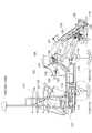 右及び左の予備苗のせ台フレーム22(第1の支持フレームに相当)が、機体11の前部の下部に連結されて横外側に延出され、右及び左のステップ21の横外側を上側に延出されている。予備苗のせ台フレーム22は、側面視でアーチ状(二股状)に構成されており、3個の予備苗のせ台23が予備苗のせ台フレーム22に支持されている。The right and left spare seedling cradle frames 22 (corresponding to the first support frame) are connected to the lower part of the front part of the