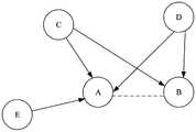 其中,M与N分别代表引用了文献i和引用了文献j的文献集。以图3为例,在图3中,共包含五篇文献ABCDE,其中,箭头指向的方向表示引用关系,AB之间的虚线用于描述AB为共被引对象,例如,箭头C至A表示文献C引用了文献A,可知,在图3中,CDE三篇文献均引用了文献A,A的施引文献集为{C,D,E},同理可得,B的施引文献集为{C,D},AB之间的共被引相似度为:Among them, M and N represent the collection of documents citing document i and document j, respectively. Take Fig. 3 as an example. In Fig. 3, there are a total of five documents ABCDE, in which the direction of the arrow indicates the citation relationship, and the dotted line between AB is used to describe AB as a co-cited object, for example, arrows C to A indicate Document C quotes document A. It can be seen that in Figure 3, the three CDE documents all quote document A, and the citing document set of A is {C, D, E}, the same can be obtained, the citing document set of B Is {C, D}, the co-citation similarity between AB is: