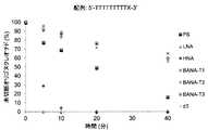 表46は、被験オリゴヌクレオチドを投与した場合ならびに生理食塩水投与の場合の血液中のアスパラギン酸トランスアミナーゼ(AST)およびアラニントランスアミナーゼ(ALT)の活性を示す。肝毒性を示すことが知られている配列(29)を投与した群では、マウスが5匹全て死亡した。一方で、配列(29)のオリゴヌクレオチドの配列の一部をBANAにて置換した配列(28)のオリゴヌクレオチドは、ほとんどALTとASTの上昇を示しておらず、毒性の低減効果が確認された。Table 46 shows the activities of aspartate transaminase (AST) and alanine transaminase (ALT) in the blood when the test oligonucleotide was administered and when the saline solution was administered. All five mice died in the group receiving the sequence (29) known to be hepatotoxic. On the other hand, the oligonucleotide of the sequence (28) in which a part of the sequence of the oligonucleotide of the sequence (29) was replaced with BANA showed almost no increase in ALT and AST, confirming the effect of reducing toxicity. ..