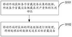 第二方面,本申请实施例提供了一种设备间数据交互的方法,包括:移动终端获取各个穿戴设备采集的数据,所述各个穿戴设备佩戴在用户身体的不同部位;移动终端对获取的所述数据进行预处理,将预处理后的数据发送至目标穿戴设备,所述目标穿戴设备为所述各个穿戴设备中佩戴在用户身体的预设部位的穿戴设备。In the second aspect, an embodiment of the present application provides a method for data interaction between devices, including: a mobile terminal obtains data collected by various wearable devices, which are worn on different parts of the user's body; The data is preprocessed, and the preprocessed data is sent to a target wearable device, where the target wearable device is a wearable device that is worn on a preset part of the user's body among the various wearable devices.