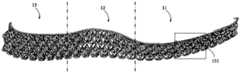 在再一种具体实施方式中,所述渐变过渡也可通过打印工艺实现,例如所述鞋中底采用3D打印工艺制成,在辐射成型过程中令第一足压干预区域之外的拓扑结构或晶格结构朝向所述至少一个第一足压干预区域之内延伸的拓扑结构或晶格结构对应接收的辐射能量密度逐渐变化,例如顺应延伸方向能量密度逐渐降低,使得固化成型的拓扑结构或晶格结构强度逐渐降低。In another specific embodiment, the gradual transition can also be achieved by a printing process. For example, the midsole of the shoe is made by a 3D printing process, and the topological structure outside the first foot pressure intervention area is made during the radiation molding process. Or the lattice structure extends toward the at least one first foot pressure intervention area, or the lattice structure corresponding to the received radiation energy density gradually changes, for example, the energy density gradually decreases in accordance with the extension direction, so that the solidified topological structure or The strength of the lattice structure gradually decreases.