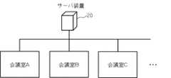 サーバ装置20は、会議の支援を行う装置である。サーバ装置20は、意思決定の場、アイディア発想の場である会議の支援を行う。具体的には、サーバ装置20は、会議の進行に共に議題に上るトピックスに関する最新情報等を参加者に提供することで会議を支援する。なお、サーバ装置20は、図3に示すように少なくとも1以上の会議室にて行われる会議の支援を行う。The