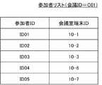 例えば、図2の例では、図10に示すような参加者リストが生成される。なお、図10では、理解の容易のため、会議室端末10に付与した符号を会議室端末IDとして記載している。また、参加者リストに含まれる「参加者ID」は利用者データベースに登録された利用者IDである。For example, in the example of FIG. 2, a participant list as shown in FIG. 10 is generated. In FIG. 10, for ease of understanding, the code assigned to the