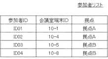 なお、会議室端末IDと各会議室端末10が設置された拠点(会議室)との関係を予めサーバ装置20に入力しておくことで、サーバ装置20は、会議室端末IDを用いて各参加者がいずれの拠点からテレビ会議に参加しているか把握できる。By inputting the relationship between the conference room terminal ID and the base (meeting room) in which each