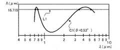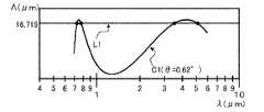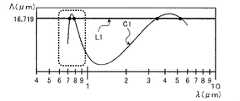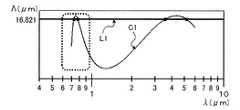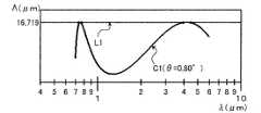 図2に例示する場合において、特性曲線C1は、近赤外領域(NIR)と中赤外領域(MIR)との間において部分的に下に凸となる谷部分C10を有し、谷部分C10の外部では全体的に上に凸である。特性曲線C1では、近赤外領域におけるピーク波長λ=λnaにて分極周期Λが極大値Λmaxとなり、且つ中赤外領域におけるピーク波長λ=λmaにて分極周期Λが極大値Λmaxとなる。又、特性曲線C1の谷部分C10では、近赤外のピーク波長λnaと中赤外のピーク波長λmaとの間の境界波長λ=λaにて分極周期Λが極小値Λminとなる。In the case illustrated in FIG. 2, the characteristic curve C1 has a valley portion C10 that is partially convex downward between the near infrared region (NIR) and the mid-infrared region (MIR), and the valley portion C10. Outside of, it is generally convex upwards. In the characteristic curve C1, the polarization period Λ has a maximum value of Λmax at the peak wavelength λ = λna in the near infrared region, and the polarization period Λ has a maximum value of Λmax at the peak wavelength λ = λma in the mid-infrared region. Further, in the valley portion C10 of the characteristic curve C1, the polarization period Λ becomes the minimum value Λmin at the boundary wavelength λ = λa between the peak wavelength λna in the near infrared and the peak wavelength λma in the middle infrared.
