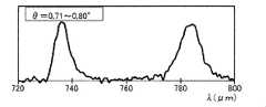 図9A~9Dでは、図7A~7Dと同様の環境において、図8A~8Dの数値計算を確認するための実験を行った。図9A~9Dでは、それぞれ図8A~8Dに対応する角度θから角度範囲0.9°分の光を波長スペクトルの計測対象とした。本実験によると、図9D,9C,9B,9Aに示すように、角度θを大きくするにつれて、2つの蛍光ピークが近づくことが確認できた。In FIGS. 9A-9D, an experiment was conducted to confirm the numerical calculation of FIGS. 8A-8D in the same environment as in FIGS. 7A-7D. In FIGS. 9A to 9D, light for an angle range of 0.9 ° from the angle θ corresponding to FIGS. 8A to 8D was measured for the wavelength spectrum. According to this experiment, as shown in FIGS. 9D, 9C, 9B, and 9A, it was confirmed that the two fluorescence peaks approached as the angle θ was increased.