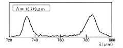 具体的に、近赤外のピーク波長λna前の交点p1と中赤外のピーク波長λma後の交点p4とが第1の光子対G1に対応しており、近赤外のピーク波長λna後の交点p2と、中赤外のピーク波長λma前の交点p3とが、第2の光子対G2に対応している。即ち、谷部分C10外部の2交点p1,p4が示す波長λn1,λm1のペアと、谷部分C10内部の2交点p2,p3が示す波長λn2,λm2のペアとが、それぞれ式(1)の理論解を構成する。Specifically, the intersection p1 before the near-infrared peak wavelength λna and the intersection p4 after the mid-infrared peak wavelength λma correspond to the first photon pair G1 and after the near-infrared peak wavelength λna. The intersection p2 and the intersection p3 before the mid-infrared peak wavelength λma correspond to the second photon pair G2. That is, the pair of wavelengths λn1 and λm1 indicated by the two intersections p1 and p4 outside the valley portion C10 and the pair of wavelengths λn2 and λm2 indicated by the two intersections p2 and p3 inside the valley portion C10 are the theory of equation (1), respectively. Construct a solution.