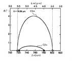 放射特性曲線C2は、式(1)を充足する光子対G1,G2における1光子が、種々の方向に放射される際の角度θと波長との関係を示す。放射特性曲線C2は、図5に示すように、中赤外のピーク部分C20と、近赤外のピーク部分C21とを有する。The radiation characteristic curve C2 shows the relationship between the angle θ and the wavelength when one photon in the photon pair G1 and G2 satisfying the equation (1) is emitted in various directions. As shown in FIG. 5, the radiation characteristic curve C2 has a mid-infrared peak portion C20 and a near-infrared peak portion C21.