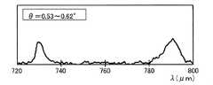 中赤外のピーク部分C20は、上述した同軸方向(即ちθ=0°)の場合の中赤外領域における第1の光子対G1の波長λm1(本例では略5μm)から第2の光子対G2の波長λm2(本例では略2μm)までに及ぶ。角度θが0°から増えるにつれて、第1の光子対G1の波長λm1は減少する一方、第2の光子対G2の波長λm2は増大している。角度θ=5°程度に到ると、中赤外領域における各光子対G1,G2の波長λm1,λm2はピーク波長λmbに縮退している(λm1=λm2=λmb)。The mid-infrared peak portion C20 has a wavelength λm1 (approximately 5 μm in this example) of the first photon pair G1 in the mid-infrared region in the above-mentioned coaxial direction (that is, θ = 0 °) to the second photon pair. It extends to the wavelength λm2 of G2 (approximately 2 μm in this example). As the angle θ increases from 0 °, the wavelength λm1 of the first photon vs. G1 decreases, while the wavelength λm2 of the second photon vs. G2 increases. When the angle θ = 5 °, the wavelengths λm1 and λm2 of each photon pair G1 and G2 in the mid-infrared region are degenerated to the peak wavelength λmb (λm1 = λm2 = λmb).