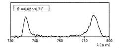また、近赤外のピーク部分C21は、同軸方向の場合の近赤外領域における第1の光子対G1の波長λn1から第2の光子対G2の波長λn2までに及ぶ。角度θが増えるにつれて、第1の光子対G1の波長λn1が増大する一方、第2の光子対G2の波長λn2は減少する。近赤外領域における各光子対G1,G2の波長λn1,λn2は、図5の例で中赤外領域が縮退した角度5°よりも小さい角度θにおいて、ピーク波長λnbに縮退している(λn1=λn2=λnb)。Further, the near-infrared peak portion C21 extends from the wavelength λn1 of the first photon pair G1 to the wavelength λn2 of the second photon pair G2 in the near-infrared region in the coaxial direction. As the angle θ increases, the wavelength λn1 of the first photon vs. G1 increases, while the wavelength λn2 of the second photon vs. G2 decreases. The wavelengths λn1 and λn2 of each photon pair G1 and G2 in the near-infrared region are degenerated to the peak wavelength λnb at an angle θ smaller than the