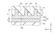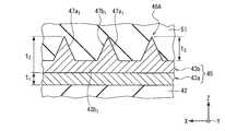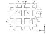 なお、凸部47aの幅W1は例えば設計値で0.06μmに設定され、凹部47bの平面サイズは設計値で例えば0.24μm×0.24μmに設定されている。また、W膜43bの平面層43b1の厚さ(t2-t3)は、例えば設計値で0.05μmに設定されている。The height t 3 of theconvex portion 47a is set to a design value of, for example, 0.3 μm with respectto the thickness t 2 (0.35 μm) of theW film 43b. The height t3 of theconvex portion 47a can also be defined as the depth of theconcave portion 47b or the height difference (step) between theconvex portion 47a and theconcave portion 47b.Further, the arrangement pitch P 1 x in the X direction and the arrangement pitch P1 y in the Y direction of theconvex portion 47a shown in FIG. 5A are both set to, for example, 0.3 μm as design values.