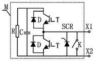 电阻R与电容C并联连接。两个可关断半导体开关T串联连接后与电容C并联连接。每个二极管D与一个可关断半导体开关T反向并联连接。两个可关断半导体开关T的连接点为子模块M的正端,电容C的负端为子模块M的负端。子模块M至少并联一个机械开关K或者电力电子开关SCR。The resistor R and the capacitor C are connected in parallel. Two semiconductor switches T that can be turned off are connected in series and then connected in parallel with the capacitor C. Each diode D is connected in anti-parallel with a semiconductor switch T that can be turned off. The connection point of the two semiconductor switches T that can be turned off is the positive terminal of the submodule M, and the negative terminal of the capacitor C is the negative terminal of the submodule M. The sub-module M is connected in parallel with at least one mechanical switch K or power electronic switch SCR.