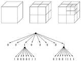 도 6의 상단의 중간에 도시된 바와 같이, 분할에 따라 전체 3차원 공간은 8개의 공간들로 분할될 수 있다. 분할된 각 공간은 6개의 면들을 갖는 큐브로 표현된다. 도 6 상단의 오른쪽에 도시된 바와 같이 8개의 공간들 각각은 다시 좌표계의 축들(예를 들면 X축, Y축, Z축)을 기반으로 분할된다. 따라서 각 공간은 다시 8개의 작은 공간들로 분할된다. 분할된 작은 공간 역시 6개의 면들을 갖는 큐브로 표현된다. 이와 같은 분할 방식은 옥트리의 리프 노드(leaf node)가 복셀이 될 때까지 적용된다.As shown in the middle of the upper part of FIG. 6 , the entire 3D space may be divided into eight spaces according to the division. Each divided space is represented by a cube with six faces. As shown in the upper right of FIG. 6 , each of the eight spaces is again divided based on the axes of the coordinate system (eg, X-axis, Y-axis, and Z-axis). Therefore, each space is further divided into 8 small spaces. The divided small space is also expressed as a cube with six faces. This division method is applied until a leaf node of the octree becomes a voxel.