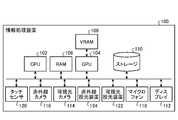 CPU102はまた、GPU104、RAM106、VRAM108、ストレージ110、ディスプレイ112、可視光カメラ114、赤外線カメラ116、マイクロフォン118、タッチセンサ120、可視光投光装置122、赤外線投光装置124等の各種デバイスを制御し、各種デバイスからの入力を処理する。The